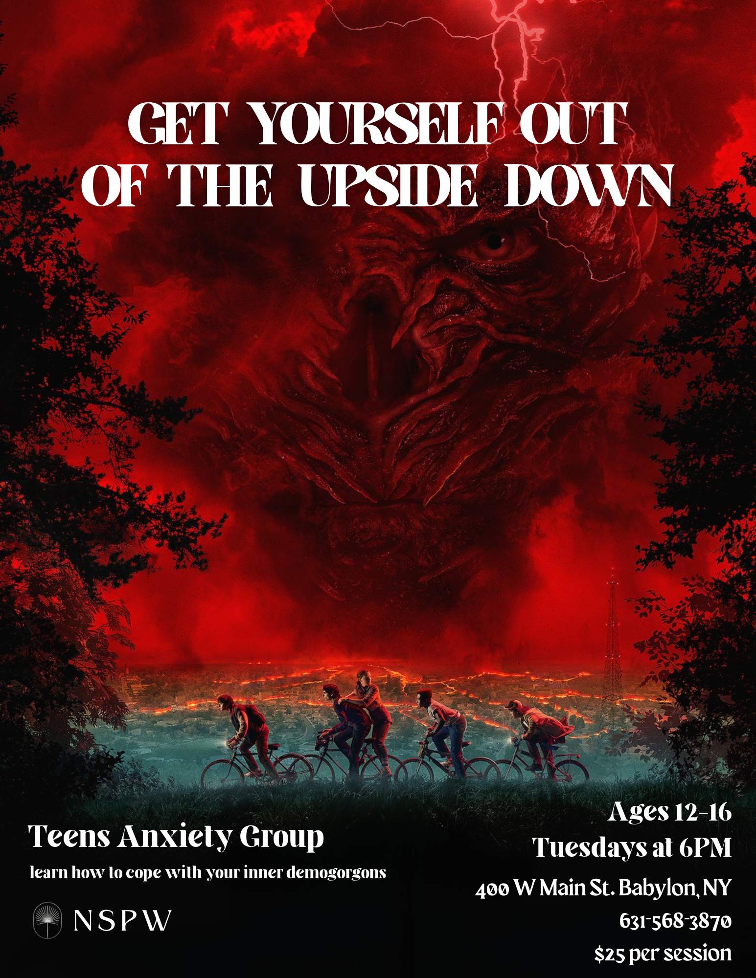 Our Teens Anxiety Group for ages 12–16 provides a supportive and relatable space for adolescents who feel overwhelmed by anxiety, stress, or intense emotions. Through guided conversation, skill-building activities, and peer connection, teens learn how to better understand their anxious thoughts, develop healthy coping strategies, and regain a sense of control in challenging situations. Using creative and age-appropriate themes, the group helps teens face their “inner demogorgons” by building confidence, emotional resilience, and practical tools they can use at school, at home, and in everyday life. Located in our Babylon office, $25 per session.